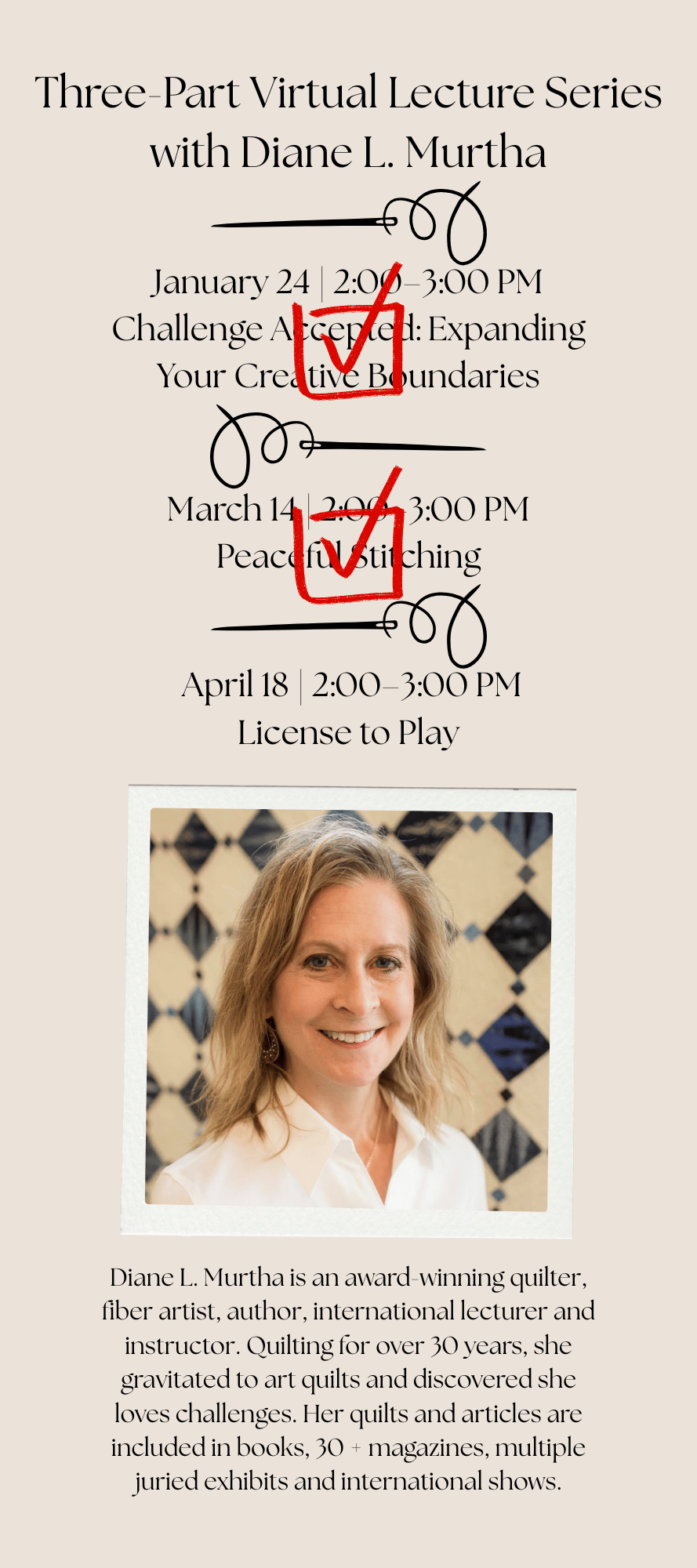 Join us online for an engaging lecture series with award-winning quilter, author, and international instructor Diane L. Murtha, hosted by the Iowa Quilt Museum