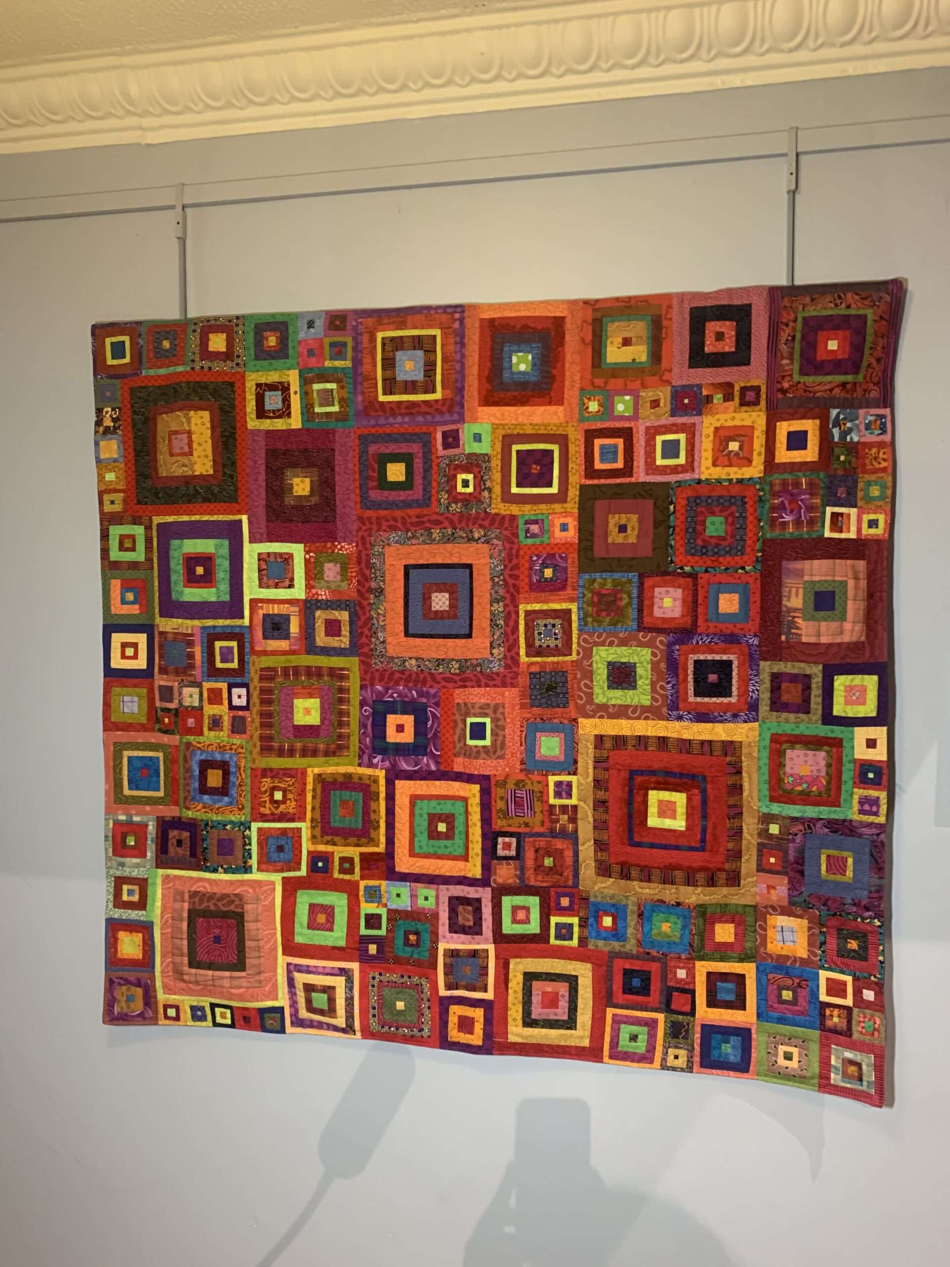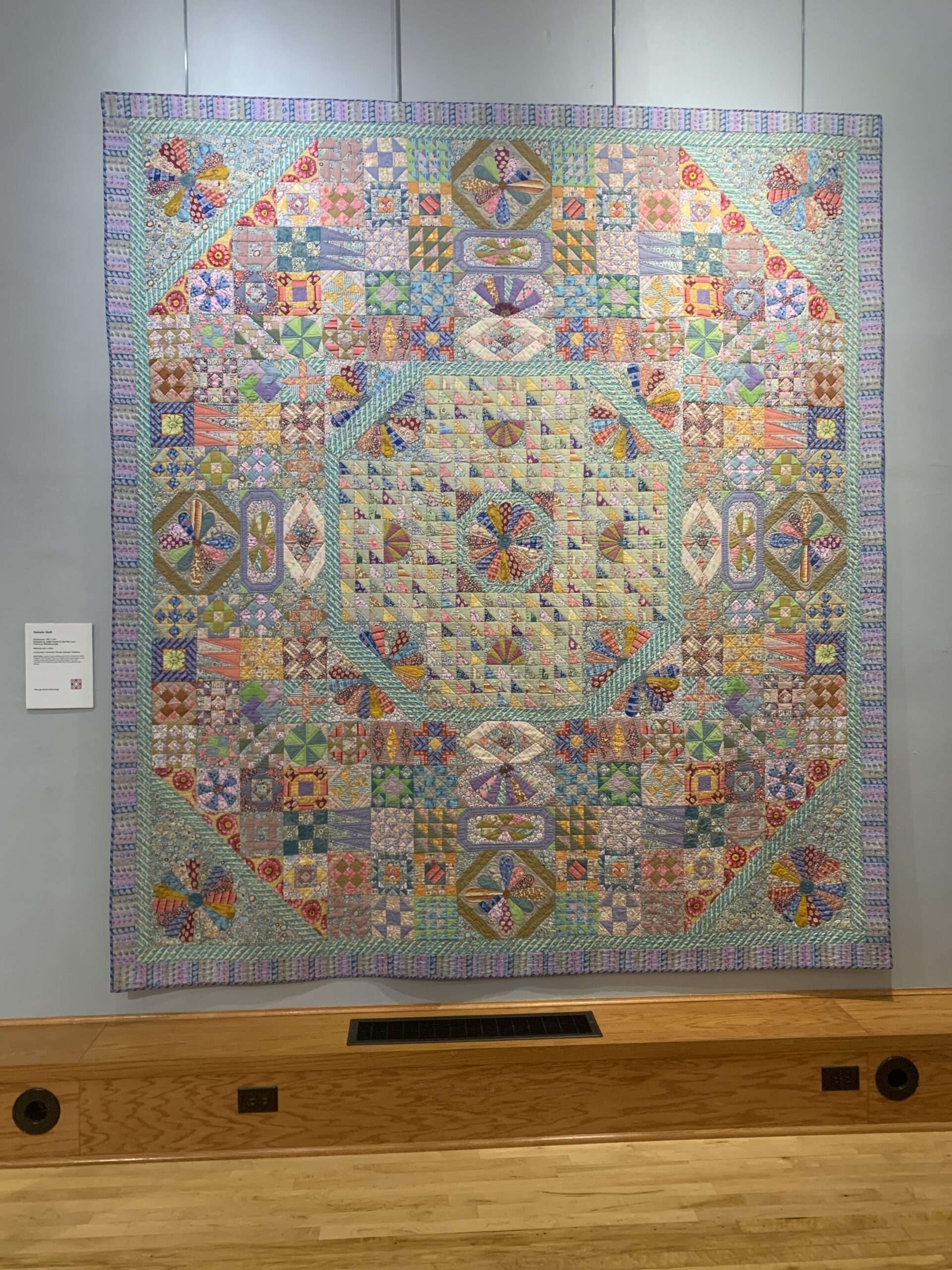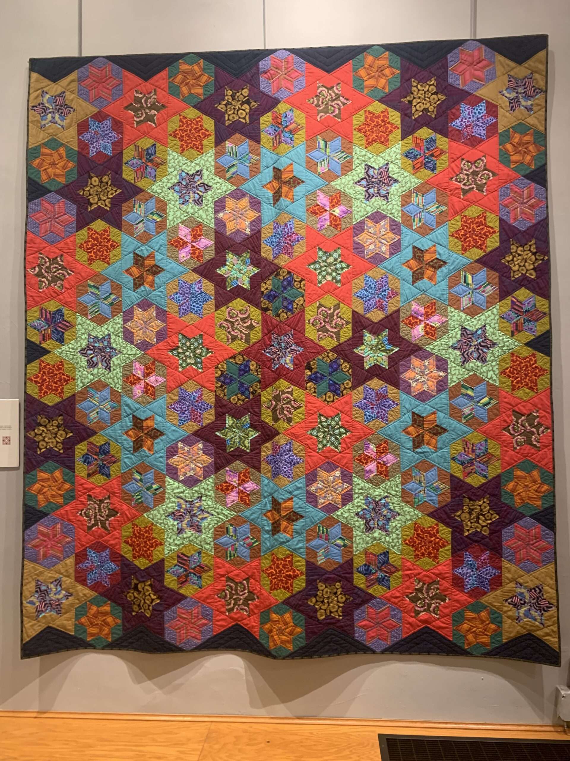 This stunning exhibit featured the work of four visionary quilt artists—Susan Lapham, Deb Cashatt, Irene Roderick, and Niraja Lorenz—each known for their intricate, small-scale piecing and bold, expressive compositions. Though their techniques and styles varied, all four artists shared a passion for using tiny fabric elements to build powerful, large-scale visual narratives.