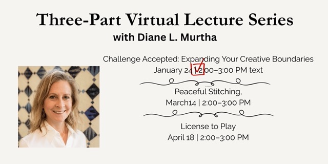 There have been a few schedule updates to Diane L. Murtha’s online lecture series. The February 21 lecture has been moved to March 14, and the March 21 lecture will now take place on April 18. If you are registered and the new dates no longer work for you, I will gladly send a viewing link to watch the lecture at your convenience or provide a refund. If the updated schedule works for you, registration remains open: https://www.iowaquiltmuseum.org/events-2/.