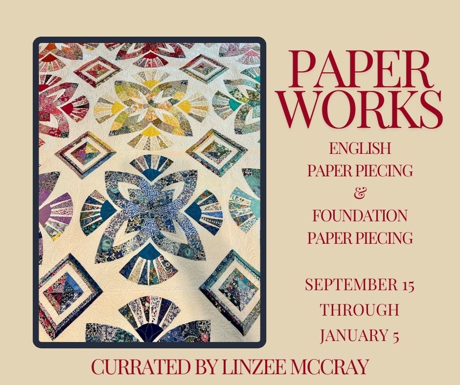 Paper Works is on display through January 5th. This exhibit features historic, traditional, and modern examples of quilts that were pieced using the techniques of English Paper Piecing (EPP) and/or Foundation Paper Piecing (FPP).