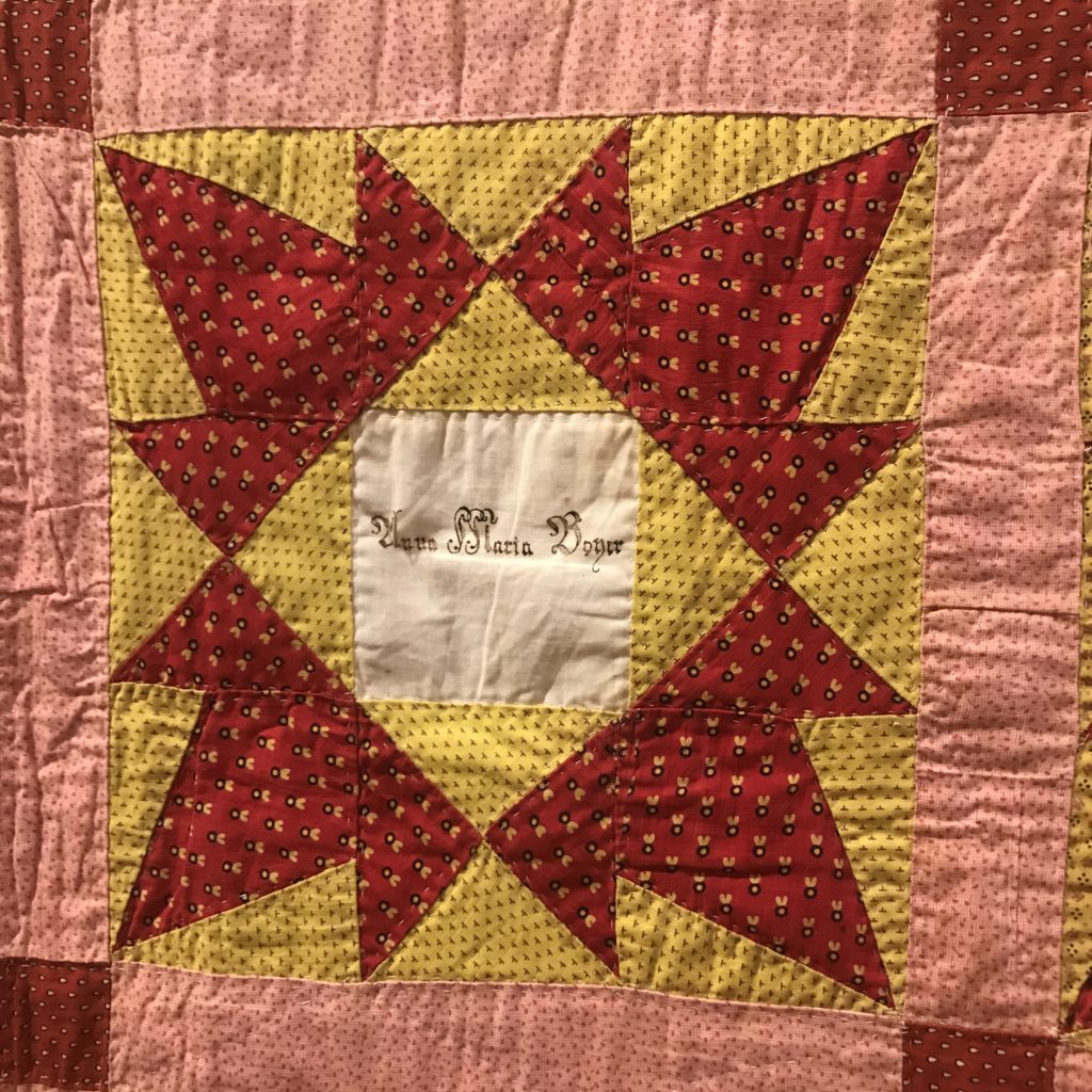 Ms. Heimbach was a prolific quilter who made hundreds of quilts in varying designs from the same fabrics for her children, grandchildren, and great-grandchildren. The script used in these blocks is called Frakture and is the lettering style used by many Germans living in Pennsylvania for formal announcements and documents such as births entered in the family bible, marriage certificates, and deeds. This unique style of lettering helped maintain cohesiveness within the German community in Pennsylvania.