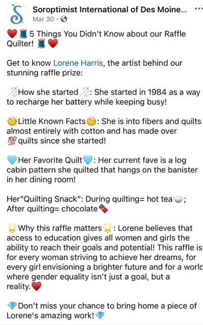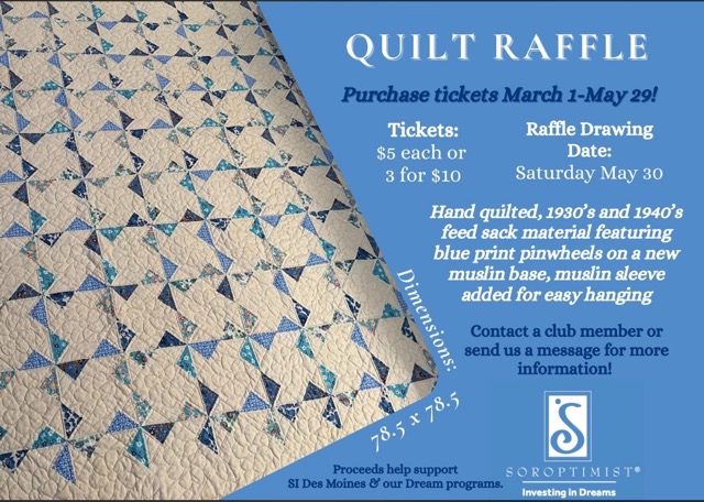 Support Soroptimist International of Des Moines and win a beautiful handmade quilt! Their current raffle features a charming pinwheel quilt created with authentic 1930s and 1940s vintage feed sack fabrics on a new muslin base, lovingly made by one of their members. Proceeds benefit Soroptimist’s Dream Programs, which help provide women and girls with access to education and opportunities for economic empowerment. To learn more or purchase raffle tickets, contact Soroptimist International of Des Moines.