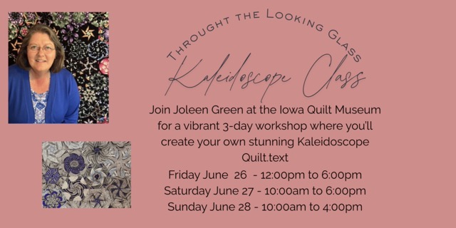 Join renowned quilt instructor Joleen Green at the Iowa Quilt Museum for a vibrant 3-day workshop where you’ll create your own stunning Kaleidoscope Quilt in our newly updated classroom space, the very first class to be held there! With more than 100 Kaleidoscope quilts to her credit, Joleen brings expert techniques, helpful tips, and years of experience to quilters of all skill levels.